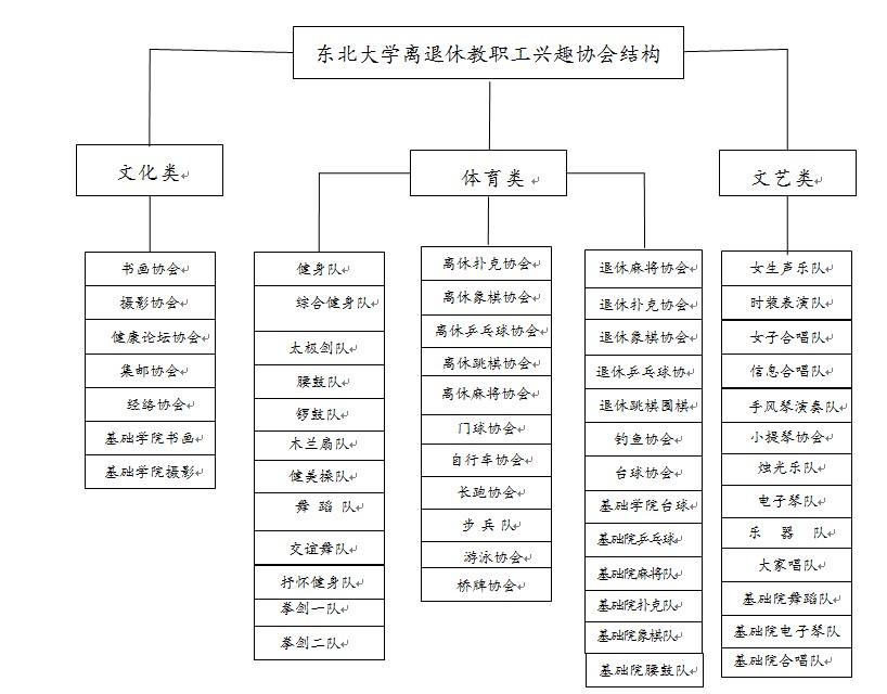 序号 兴趣协会名称 姓 名 序号 兴趣协会名称 姓 名 1 离休麻将 张玉兰 24 服装队 谢珉树 2 离休扑克 王荣德 25 集邮协会 王滨 3 离休象棋 生宪武 26 健康长寿协会 万桂馥 4 离休乒乓球 翟庆良 27 老教授合唱队 郭长武 5 离休跳棋 甘辛 28 铜铃小合唱队 张巍 6 桥牌 赵天鸣 29 健身操队 老忠奎 7 书画协会 杨如胜 30 健美操队 孙佑兰 8 台球 乔庆祥 31 综合健身队 陈桂凤 9 退休麻将 安学敏 32 抒怀健身队 李博 10 退休扑克 刘国良 33 太极拳队 张秀珍 11 退休乒乓球 万宏恕 34 太极剑队 潘汝明 12 退休跳围棋 孔昭环 35 木兰扇队 刘绍兰 13 退休象棋 李树春 36 门球队 刘忠勤 14 小提琴 余迎新 37 长跑队 丁庆恕 15 手风琴 于凤清 38 自行车队 吕连才 16 电子琴 张秀艳 39 步兵队 袁进恩 17 民乐队 王永军 40 游泳队 毕砚书 18 烛光乐队 王文学 41 钓鱼协会 田元夫 19 葫芦丝 闫玉兰 42 摄影协会 王金章 20 女子合唱队 王月花 43 舞蹈队 刘东琪 21 女声小合组 隋淑玲 44 交谊舞队 崔凤兰 22 大家唱 袁文菊 23 信息合唱队 孙海林 离退休各分会负责人(2010年) 分会 名称 姓名 职务 分会名称 姓名 职务 材料与冶金学院 杨宝安 会长 机械厂 崔凤兰 会长 刘秀儒 副会长 刘国良 副会长 王振范 副会长 高玉洁 副会长 李广田 副会长 机械工程与自动化学院 孙秀臣 会长 程力智 副会长 陈淑华 副会长 财经处 龙丰泽 会长 张纯宇 副会长 后勤处 马方安 会长 刘宝贤 副会长 产业 集团 盛永红 会长 基础 学院 李宝华 会长 张纪群 副会长 王玉坤 副会长 工商管理学院 张凤珍 会长 夏立芳 副会长 钟磊刚 副会长 潘育红 副会长 后勤服务中心 李长云 会长 吴来君 副会长 隋淑玲 副会长 基建处 高树忠 会长 夏莹 副会长 吕菊梅 副会长 王化臣 副会长 继续教 育学院 王景芬 会长 机关一 贾永生 会长 孙广生 副会长 李琳 副会长 理学院 蔡士端 会长 李湘涛 副会长 万宏恕 副会长 机关二 齐海楼 会长 齐秉寅 副会长 朱玉华 副会长 朱莲凤 副会长 体育部 姜庆祥 会长 赵宝华 副会长 图书馆 赵淑斌 会长 研究院 李桂新 会长 杨东旭 副会长 吴玉琴 副会长 信息科学与工程学院 高念富 会长 医院 白淑梅 会长 孙海林 副会长 屈万英 副会长 刘书生 副会长 田瑛 副会长 吴恩庚 副会长 英才学院 崔亚春 会长 许桂芝 副会长 轧钢重点实验室 方凤珍 会长 刘斌 副会长 郭长武 副会长 外国语学院 裕桂斌 会长 资源与 土木工 程学院 高福聚 会长 艾素环 副会长 刘斌 副会长 文法 学院 邱广君 会长 余仁焕 副会长 朱俊勤 副会长