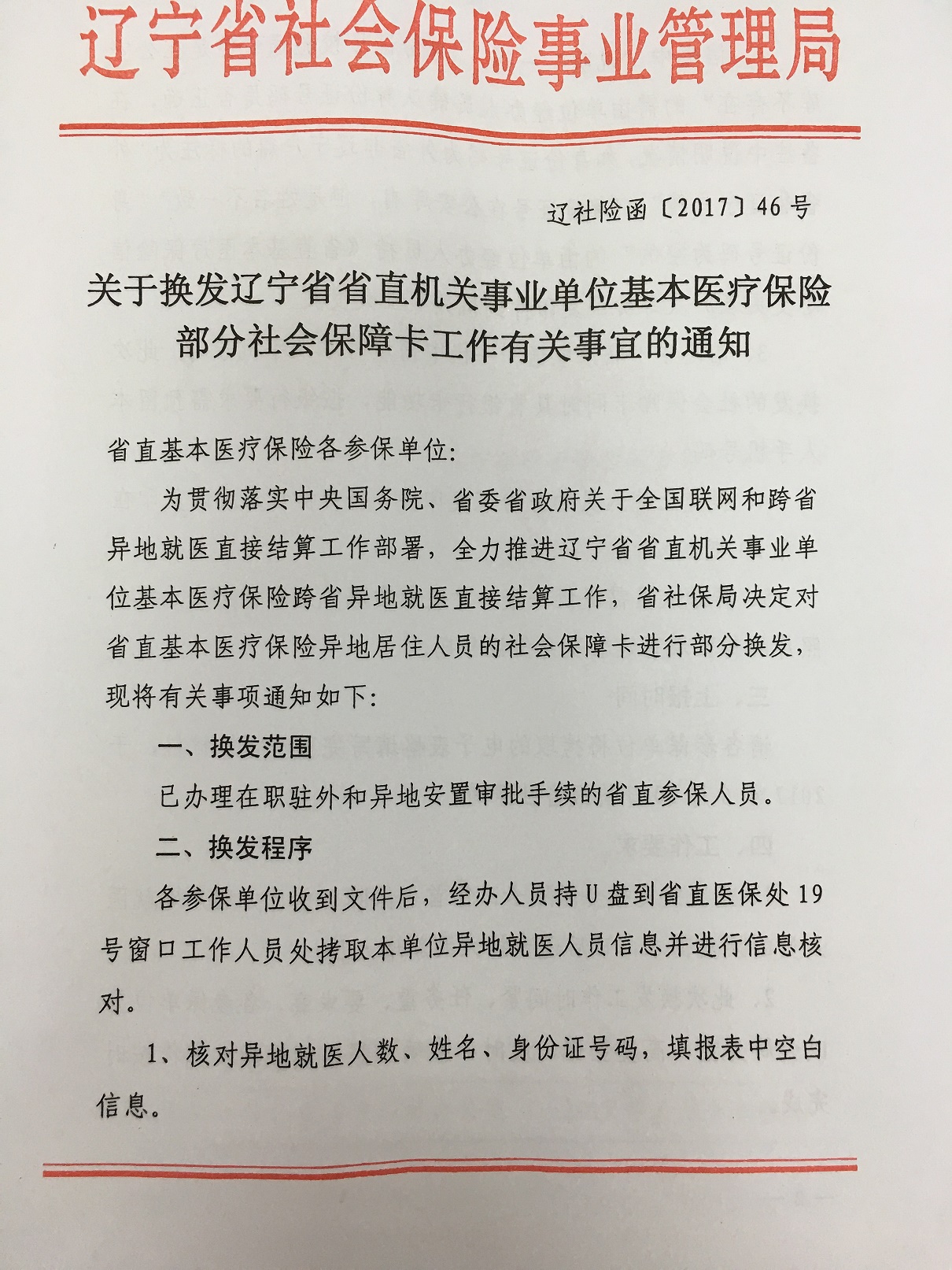 关于换发辽宁省省直机关事业单位基本医疗保险部分社会保障卡工作有关事宜的通知