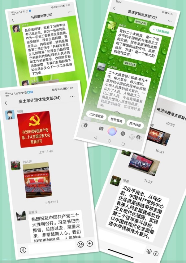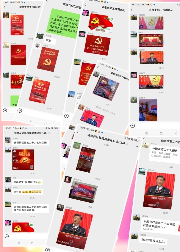 10月16日,中国共产党第二十次全国代表大会在北京人民大会堂隆重开幕。习近平总书记代表第十九届中央委员会向大会作报告。离退休党委组织全体党员、老同志线上收听收看大会直播,并在微信群内展开交流学习。