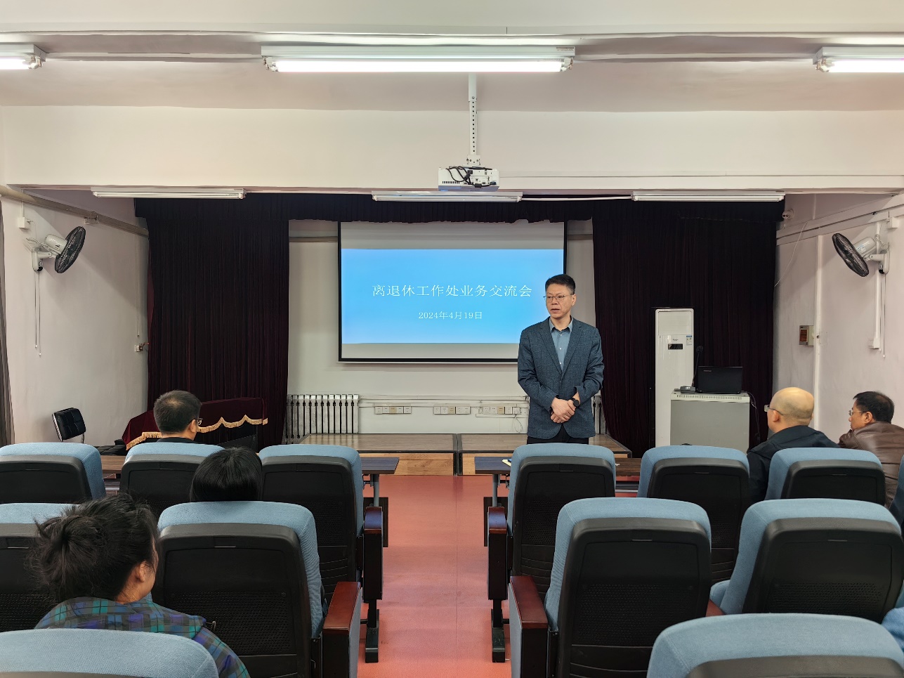 2024年4月19日,离退休工作处在2号楼召开工作业务交流会,全体工作人员参加,会议由离退休工作处处长吕兴君主持。