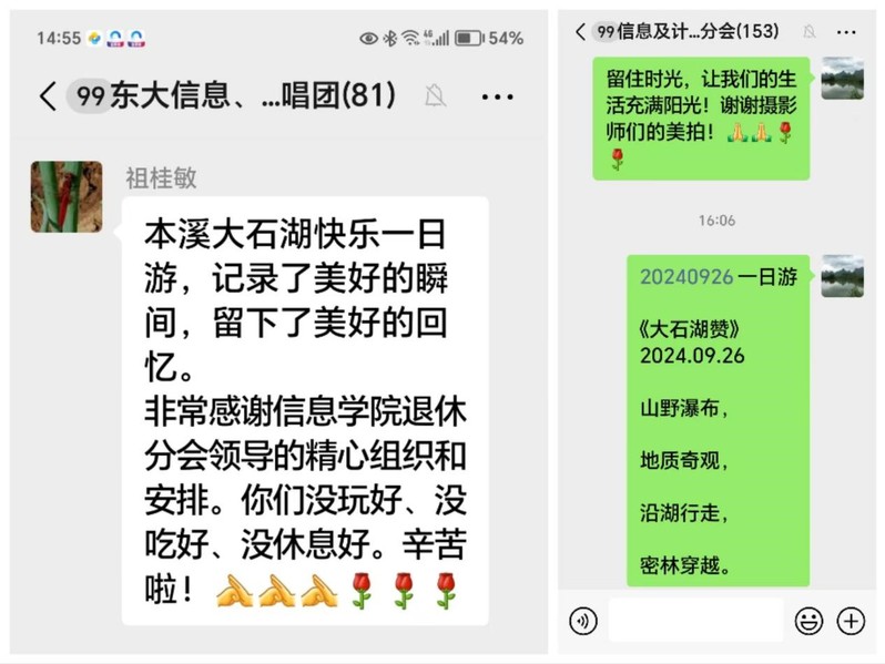 一日游结束了,老师们收获了满满的幸福感,踏上了返程的路。一路上对本次旅游赞不绝口,纷纷在群里留言,见证了大石湖之旅,如下截屏: