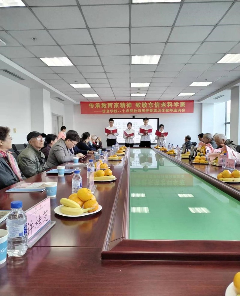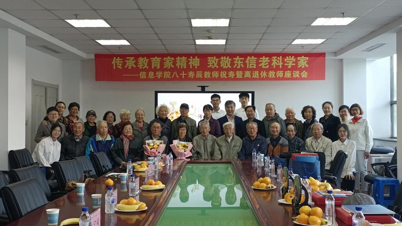 岁月往来,今又重阳。在这艳阳高照的深秋季节,信息学院为八十岁老教师祝寿活动拉开序幕。学院领导、工会、团委联合离退休信息支部和分会,将尊老、爱老、敬老活动进行到底!10月11日(九月初九)重阳节当天信息学院为年满80周岁的老教师组织了祝寿活动。会议于下午2点在校综合楼308室如期举行,到会的共有两位寿星--齐书聪老师和荣西林老师。参加会议人员有学院八十岁以上的老教师若干、学院领导李鸿儒院长、武建军书记、吕志娟副院长、工会主席王姝及学生代表出席会议。工会主席王姝主持了会议。