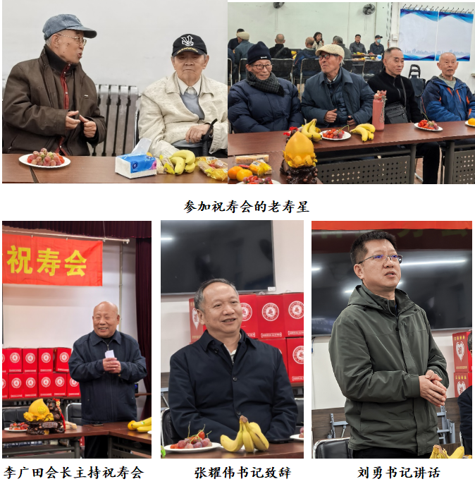 祝寿会由李广田会长主持,他首先介绍参加祝寿会的嘉宾:冶金学院党委书记张耀伟、院办主任陈旭东、离退休处党委书记刘勇、科长于博,接着介绍1位百岁、7位九旬、7位八旬的“冶金前辈”并致以最诚挚的祝福。